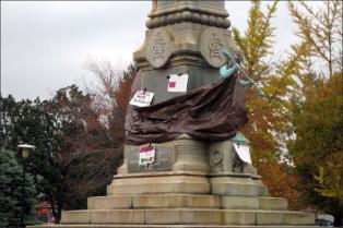 The protesters gathered around the monument and tied up posters and banners calling for an end to racism and bigotry.