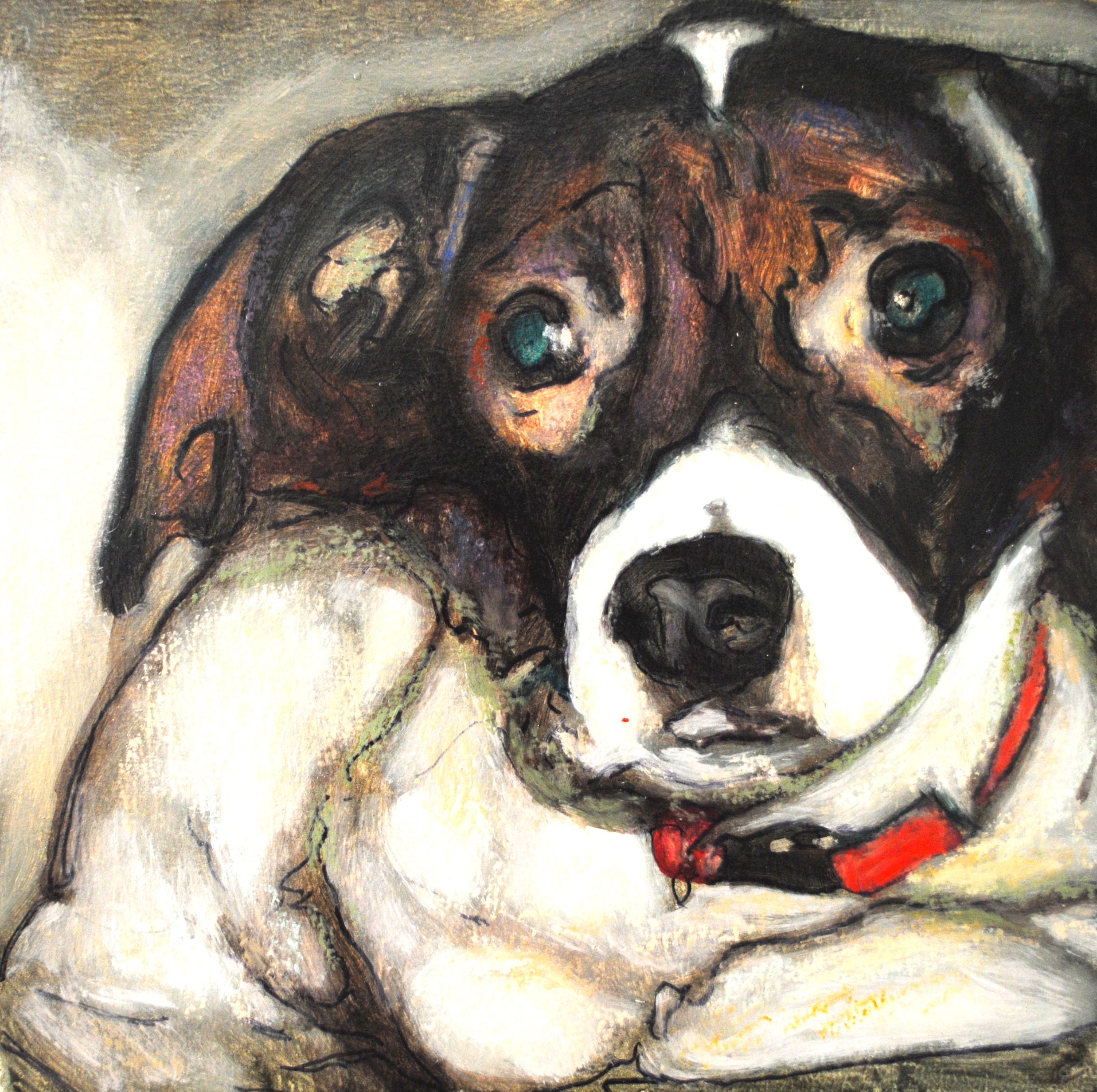 Barone takes intermittent breaks from painting portraits for the series in favor of painting other work, but this other work is never too far removed from what the An Act of Dog project is about, and dogs are always included in them. The “break” paintings are usually larger in size than those of the series, which Barone says allows him to explore not just the faces of the dogs, but also the scenery and how the dog plays into it. Some images are whimsical, like a dog playing with his master in a dog park; some are grim, like a lone dog in a gas chamber at a kill shelter.
