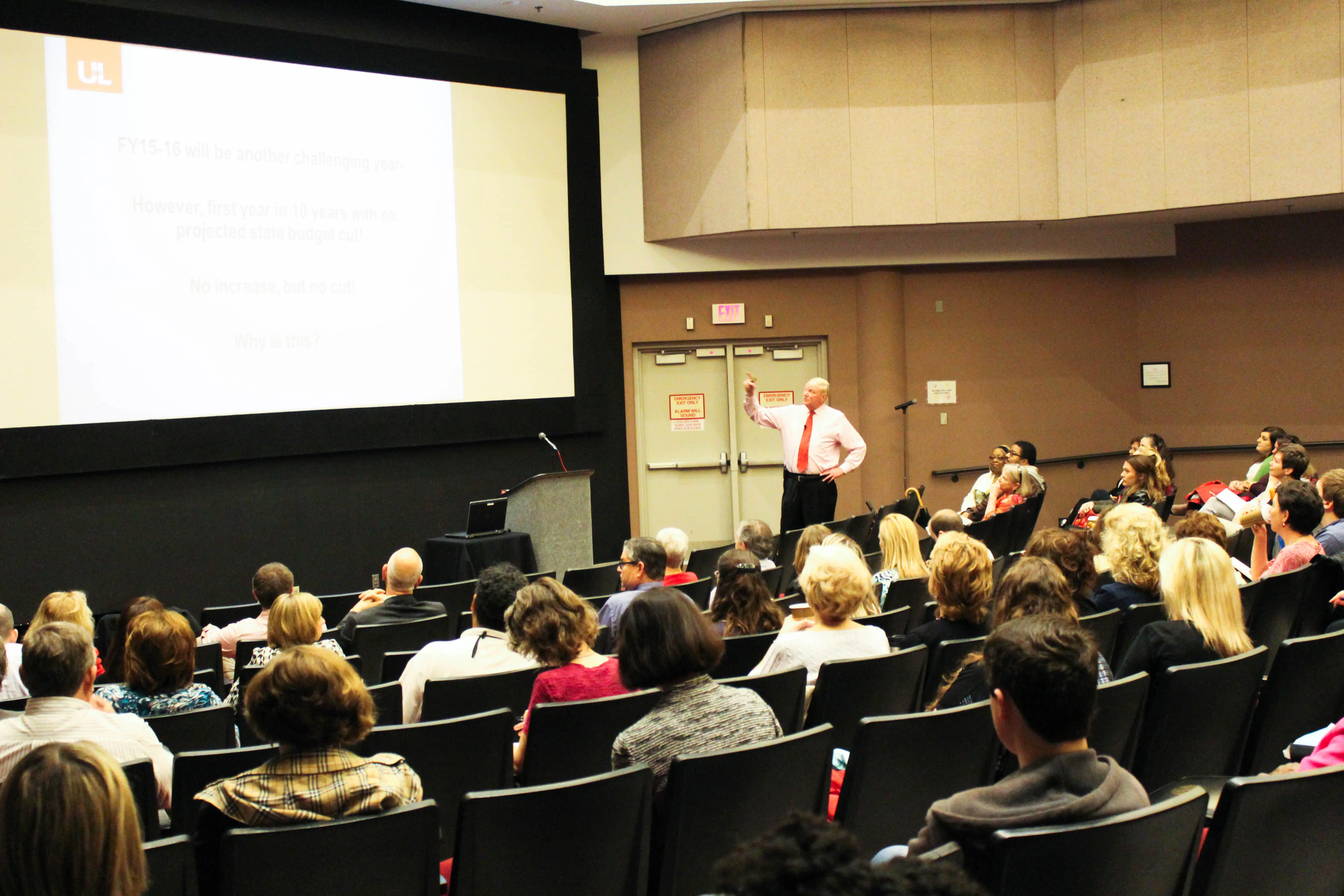 Last Thursday, students, faculty and staff had a unique opportunity – they could ask President James Ramsey about how U of L plans to spend money in the 2015-2016 fiscal year, beginning July 1. Students and faculty alike attended the event in the Floyd Theater on April 16, eager to hear the plan for the upcoming year.