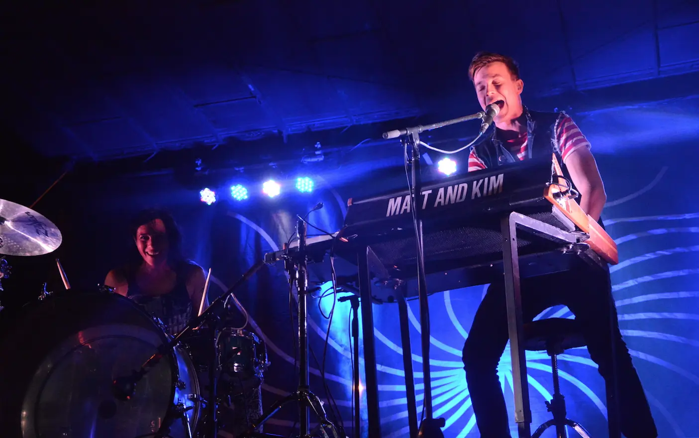 After Twin Limbs closing song, the stage crew immediately moved a platform with a drum set and a keyboard that read “MATT AND KIM,” to the edge of the stage.
