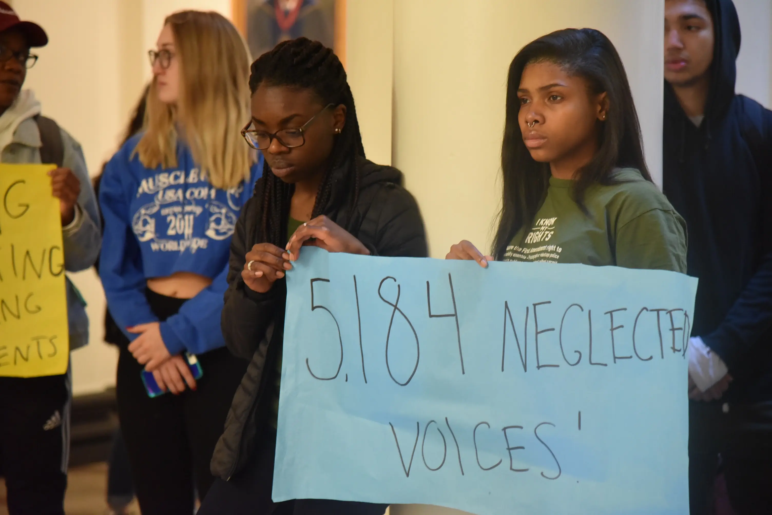 The protesters stood outside Postel’s office in silent support of the students. They faced the windows of the office with signs as the meeting continued.