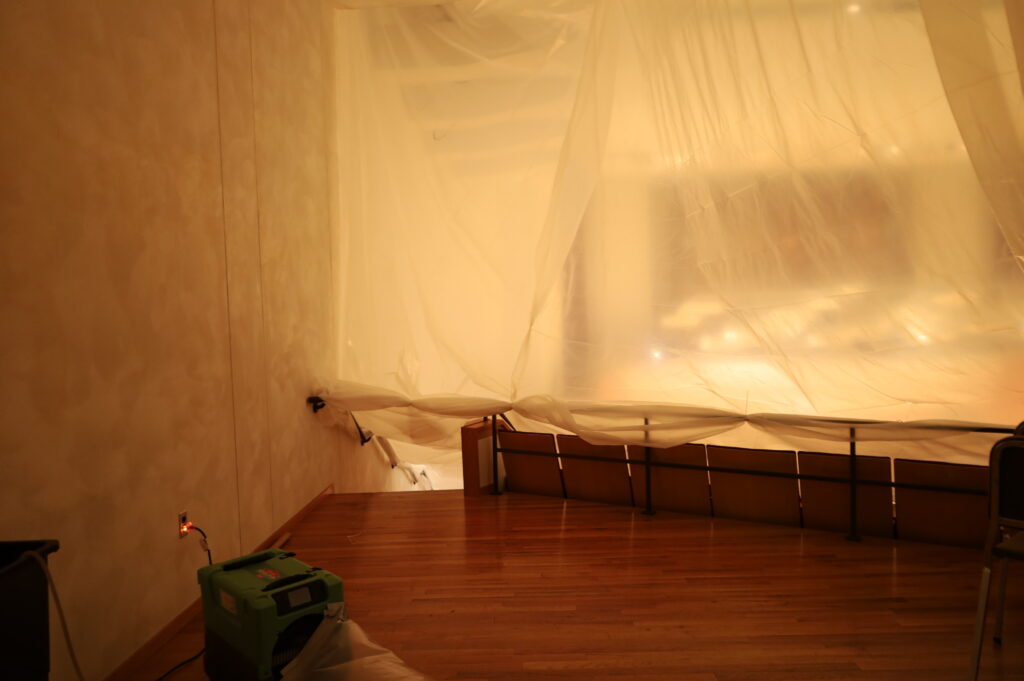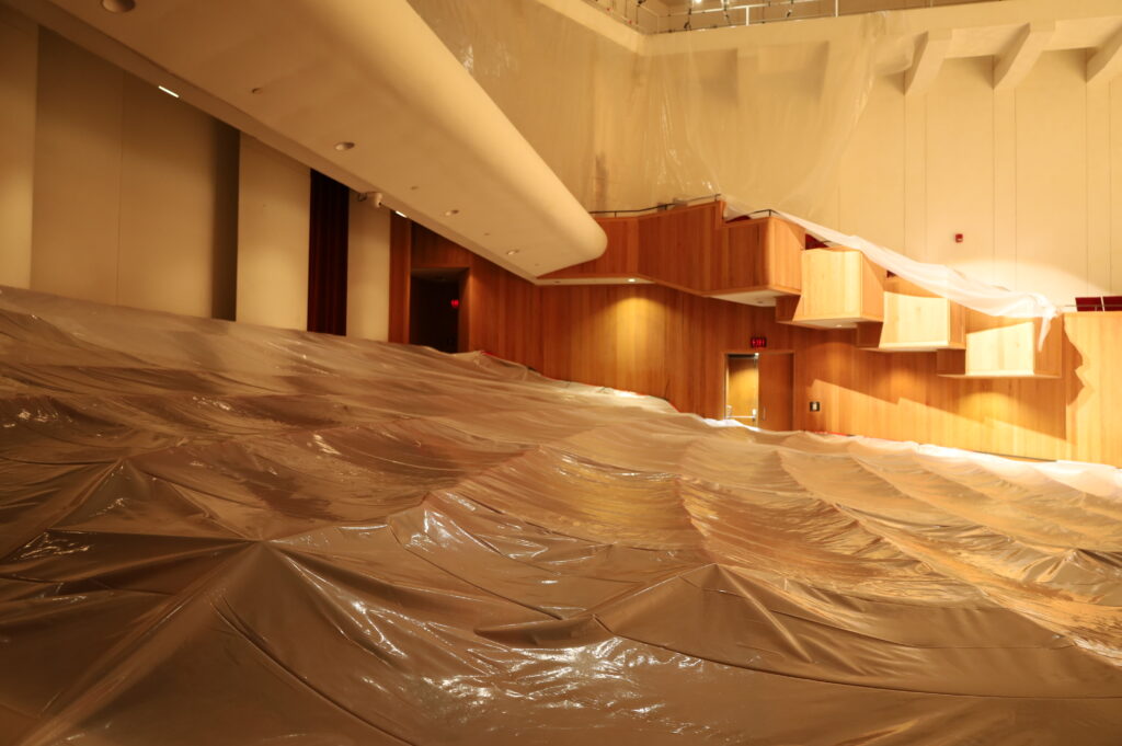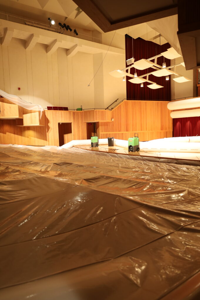 Student-workers made swift work of moving and covering any instruments on the stage or in the building that could have been affected by the flooding.
