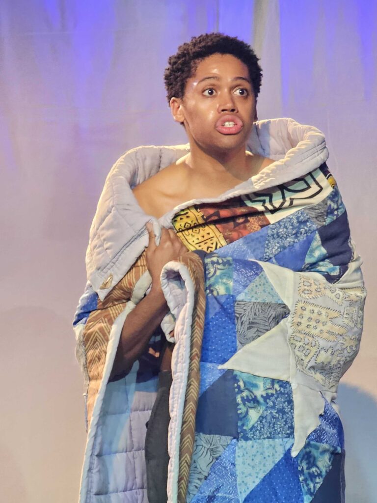 After the performance, Dr. Lundeana Thomas stepped out into the aisle, wearing a red suit, to interrupt the show’s extended standing ovation. She is the former director of the African American Theater Program. Walking down the aisle, she held out her hands, grinning, and announced that she had something for the cast. With the help of a couple of techs, she gave a bouquet to each cast member, including the play’s director. Armed with red and white bouquets, the cast bowed a final time.