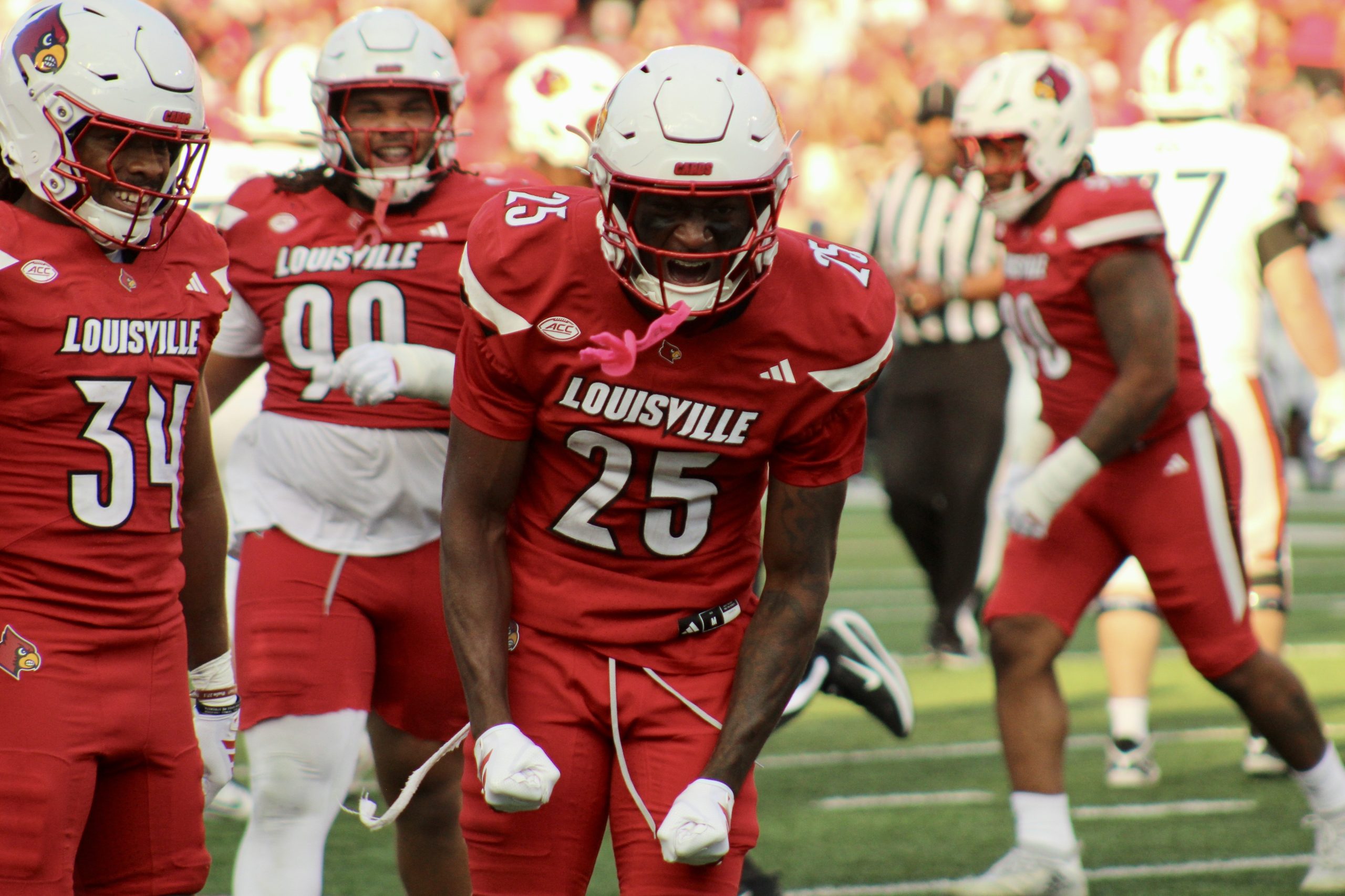 Louisville defensive back Tayon Holloway gets pumped up with teammates. (Harrison Plank/The Louisville Cardinal)