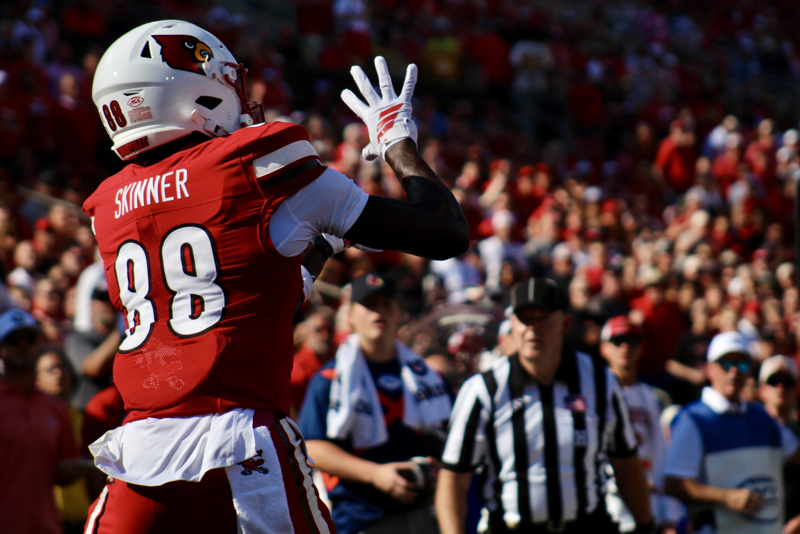 Louisville tight end Jaleel Skinner extends his hands to catch a pass. (Harrison Plank/The Louisville Cardinal)