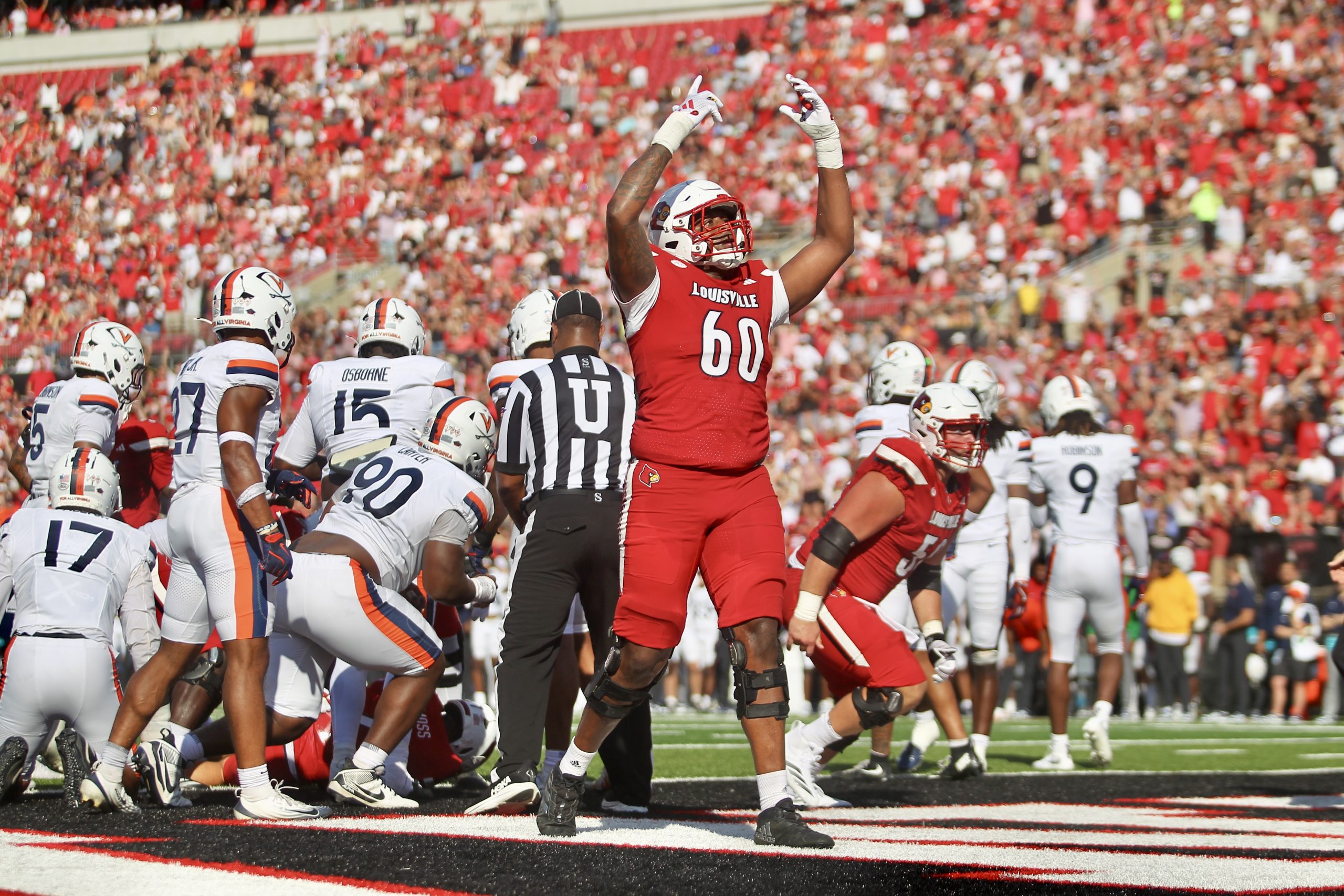 Louisville offensive lineman Rasheed Miller celebrates a rushing touchdown. (Vinny Porco/The Louisville Cardinal)