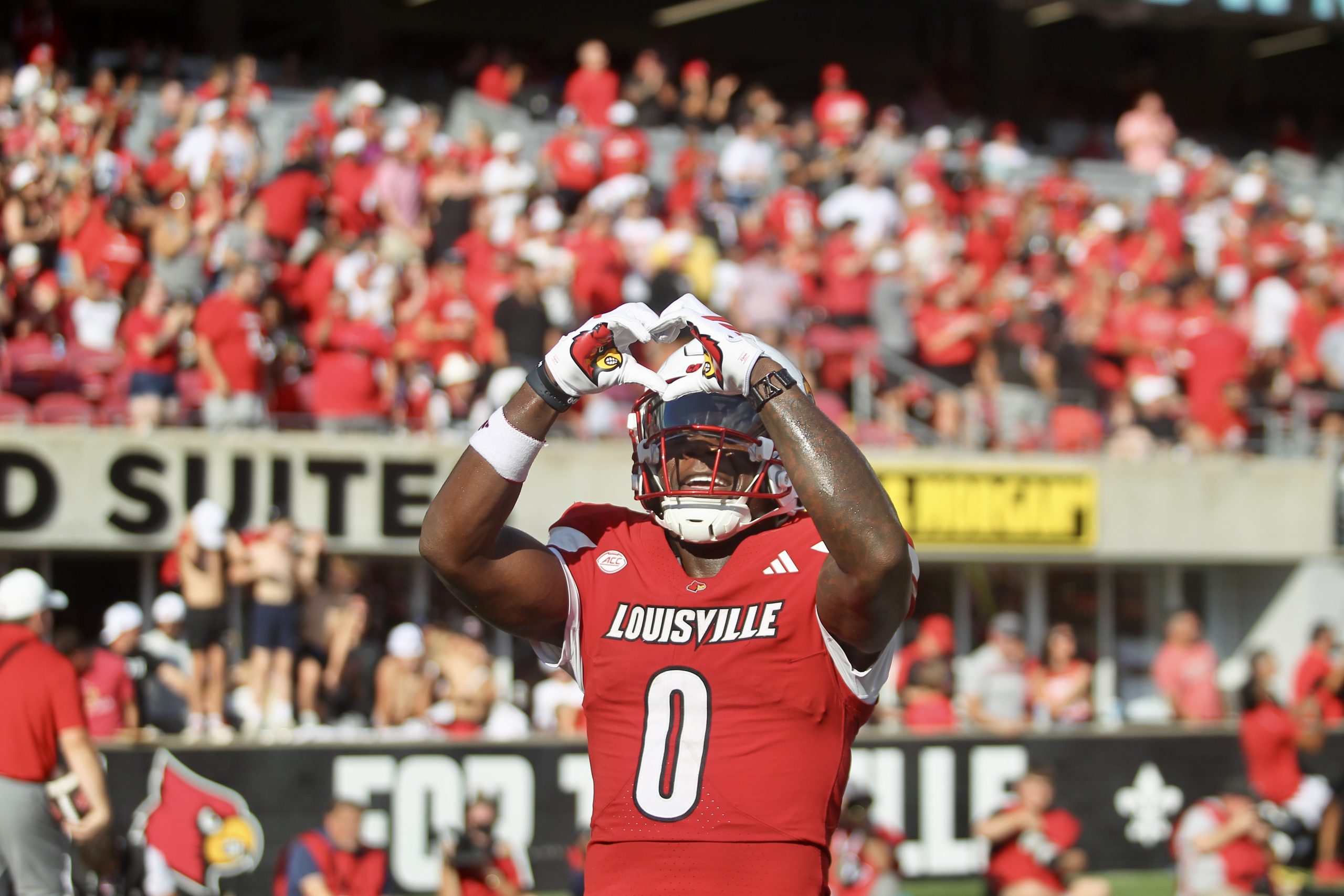 Louisville receiver Chris Bell shows love to Louisville football fans after a receiving touchdown. (Vinny Porco/The Louisville Cardinal)