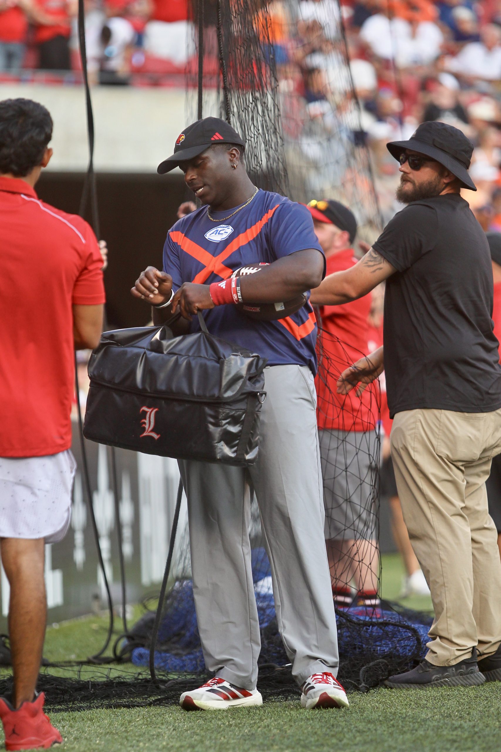 Louisville football manager Zephian Wade removes his bracelet to give to a young fan. (Vinny Porco/The Louisvillle Cardinal)