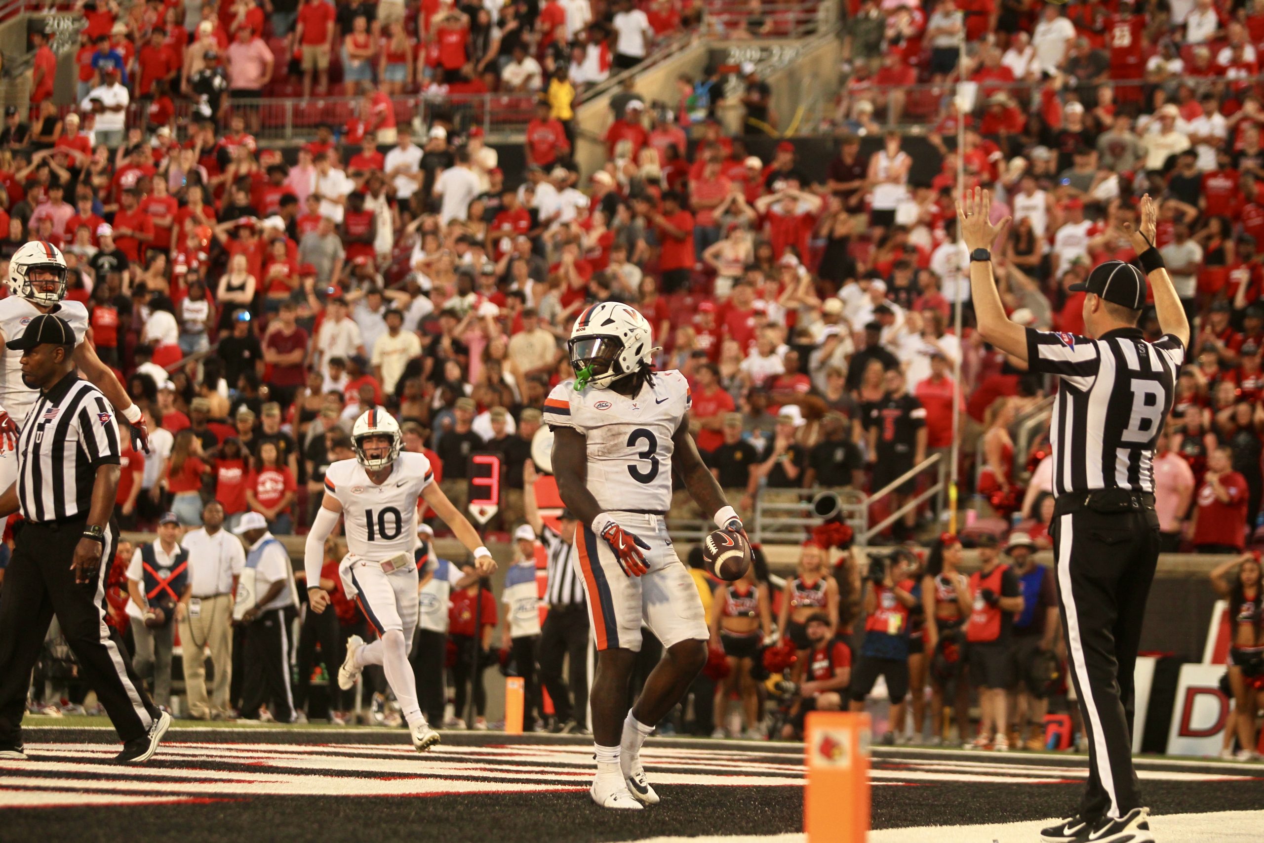 Virginia running back J’Mari Taylor scores a rushing touchdown to seal a win over Louisville in overtime. (Vinny Porco/The Louisville Cardinal)