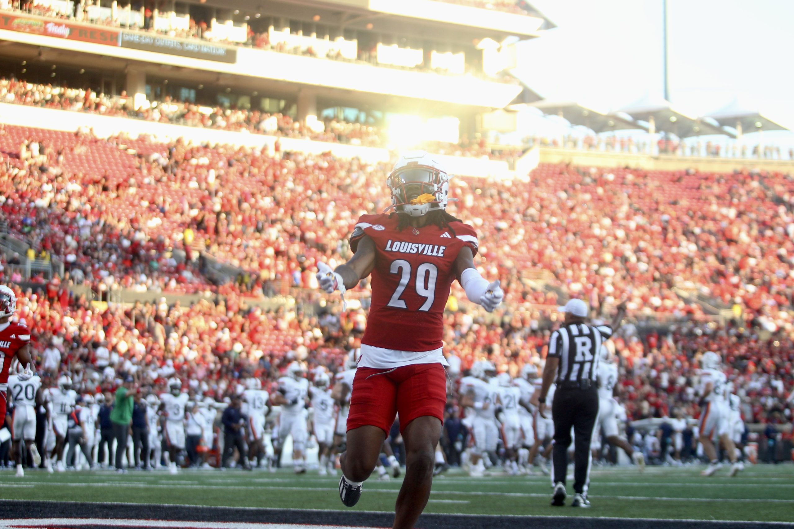 Quarterback Miller Moss runs back to Louisville’s sideline after throwing a touchdown pass to Chris Bell. (Nolton Alfred/The Louisville Cardinal)