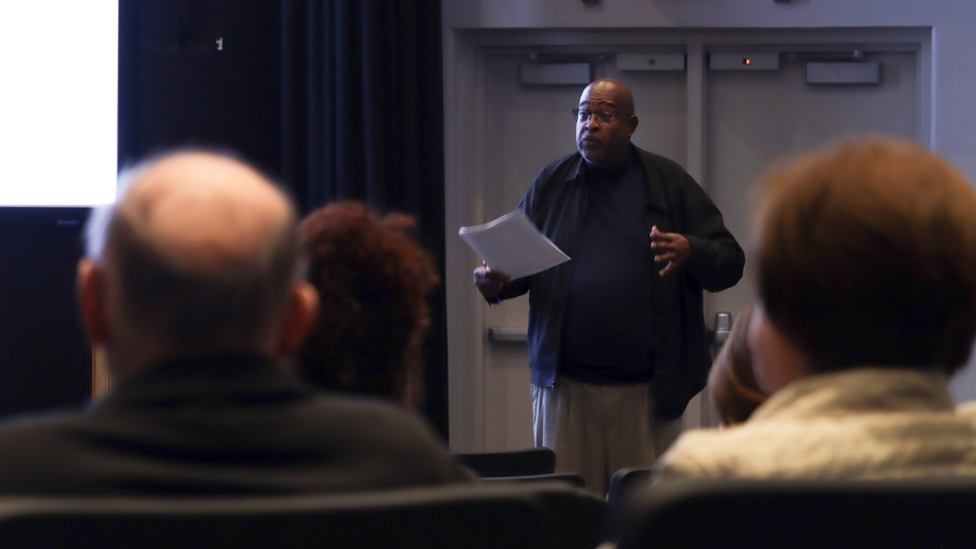 Dr. Tomás Edison gives context to the Colombian film La Suprema prior to its screening on Oct. 23, 2025. (Photo by Sara Montoya / The Louisville Cardinal)