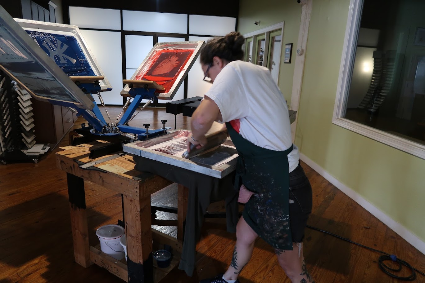 Katherine Knudsen works the printmaking machine, Oct. 20, 2025. (Photo by Kylie Cox / The Louisville Cardinal)