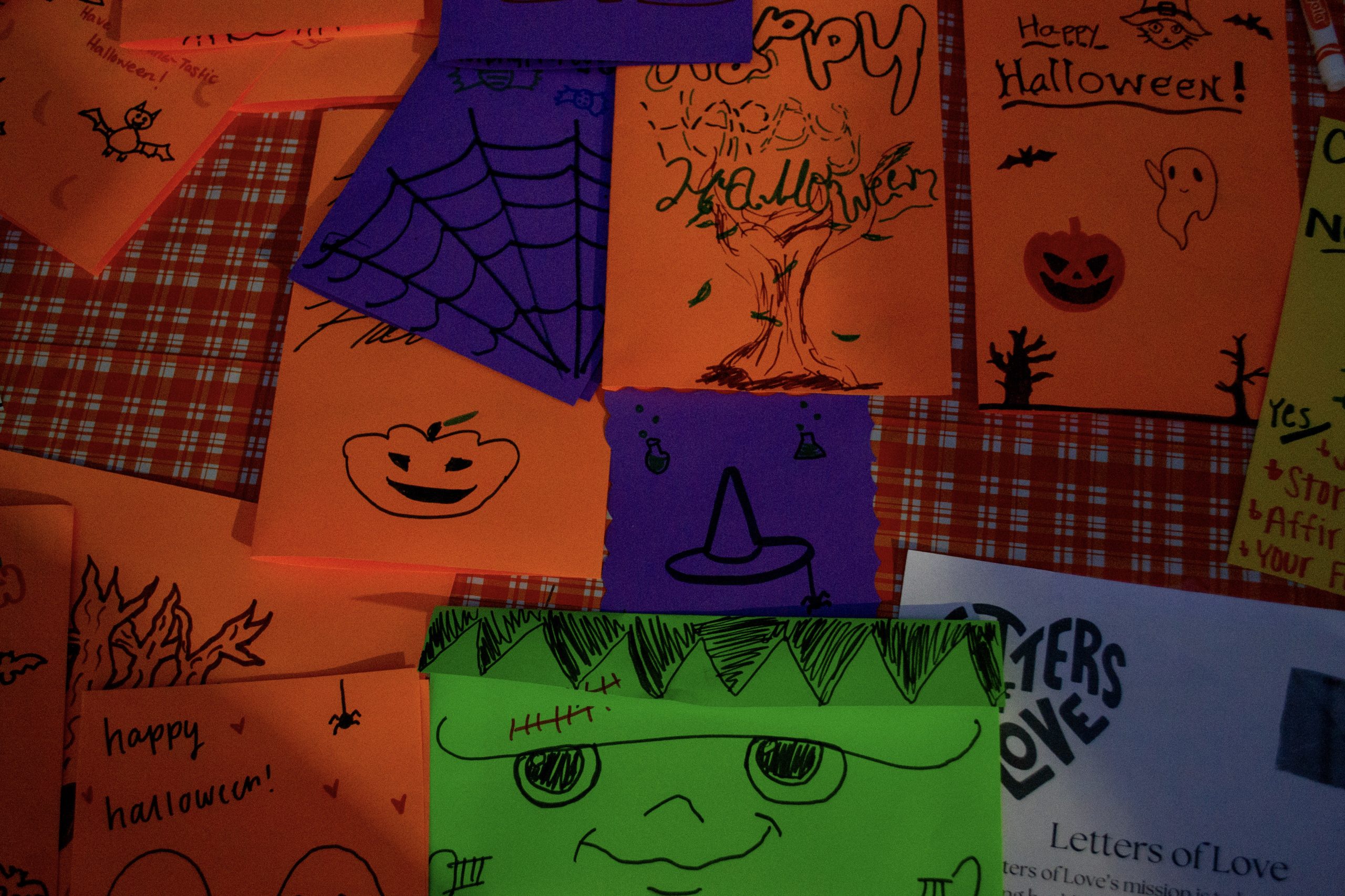 “Happy Halloween” cards created by U of L students for Letters of Love non-profit, Oct. 8, 2025. The cards will be given to children battling severe illness. (Photo by Mel Banta/The Louisville Cardinal)