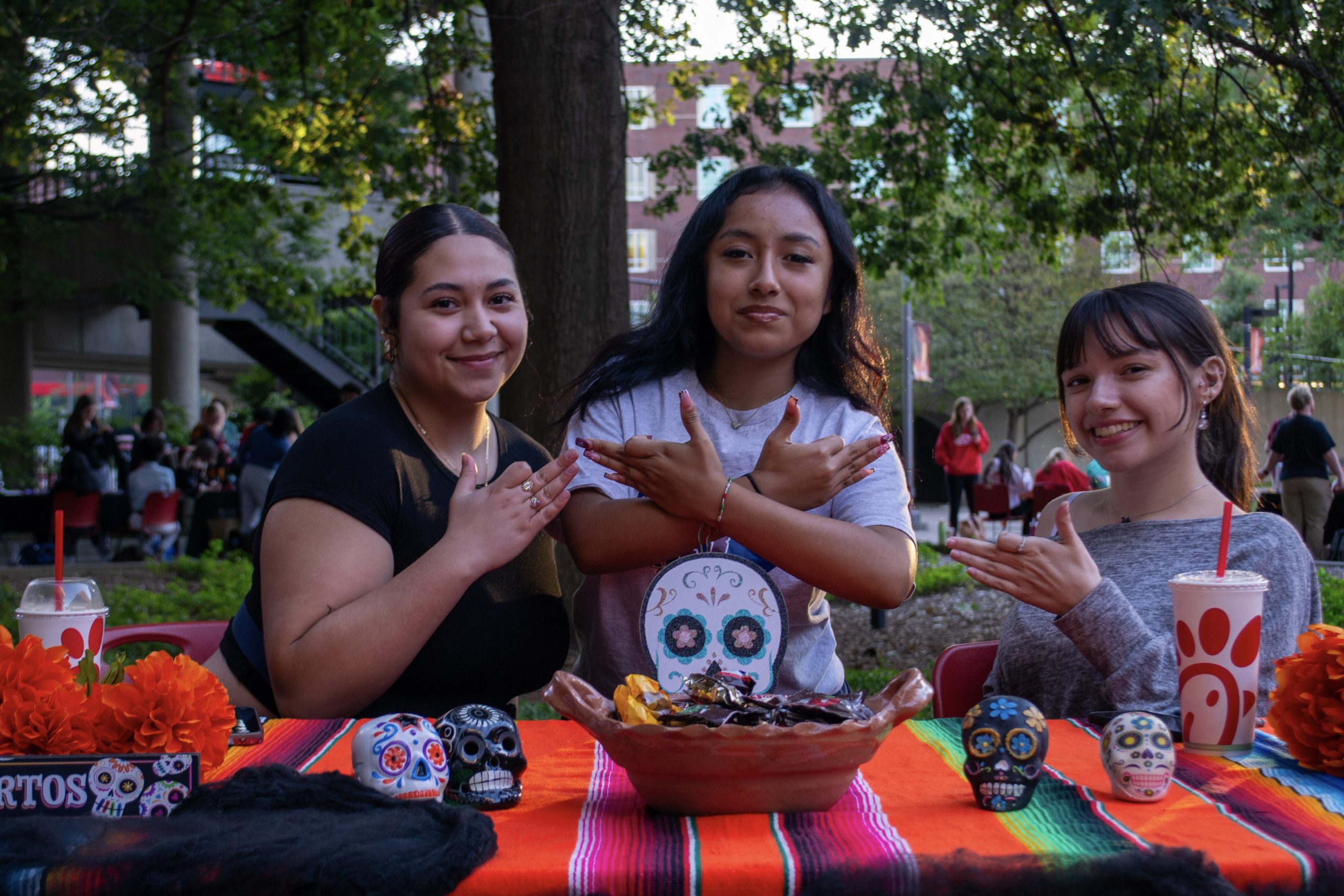 Students representing Gamma Phi Omega table at the SAB Fall Festival, Oct. 8, 2025. They sported a Dia De Los Muertos-themed table, the Mexican holiday is celebrated from Nov. 1-2. (Photo by Mel Banta/The Louisville Cardinal)
