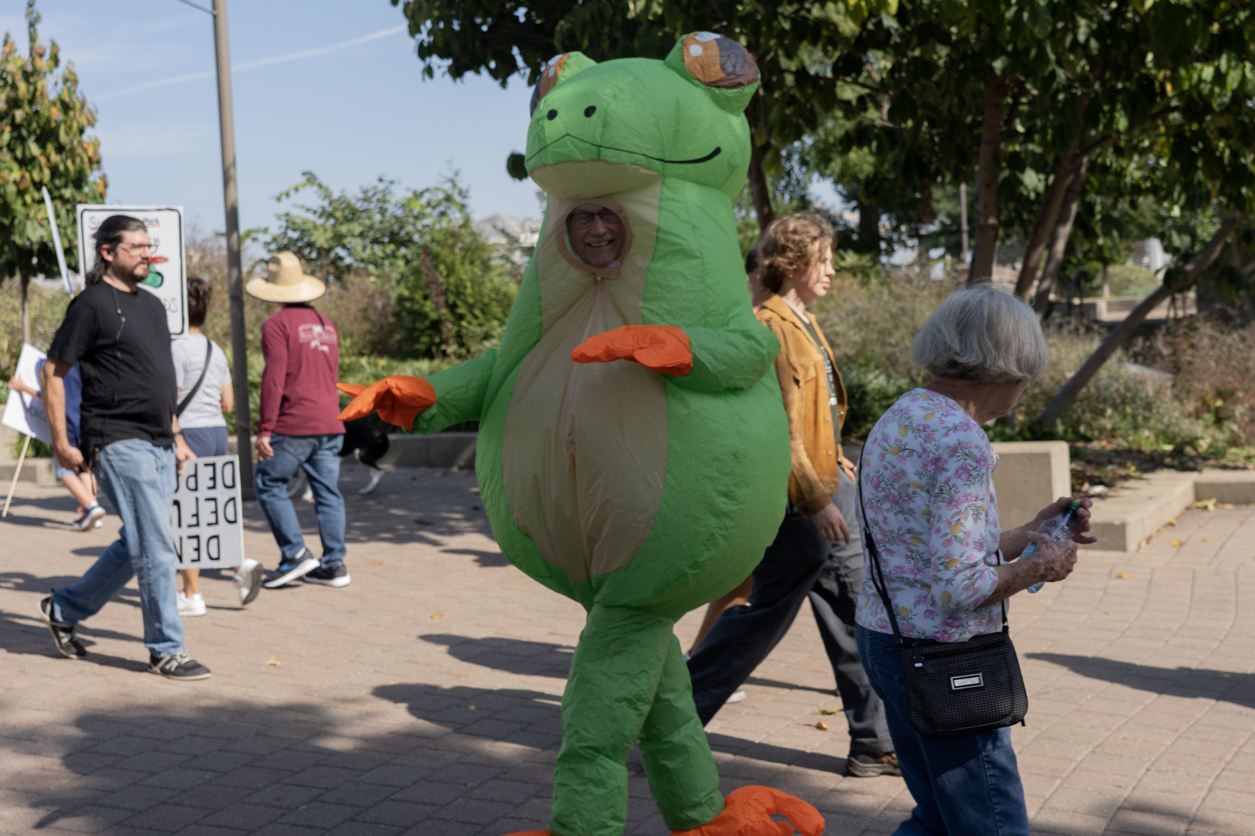 Some individuals attending chose to wear animal inflatable costumes. Bears, unicorns, dragons and most notably frogs were all present. Frog costumes have recently become a symbol for nonviolent protests after an incident in Portland, Oregon, involving an ICE spraying tear gas in a frog inflatable during a protest on Oct. 2.