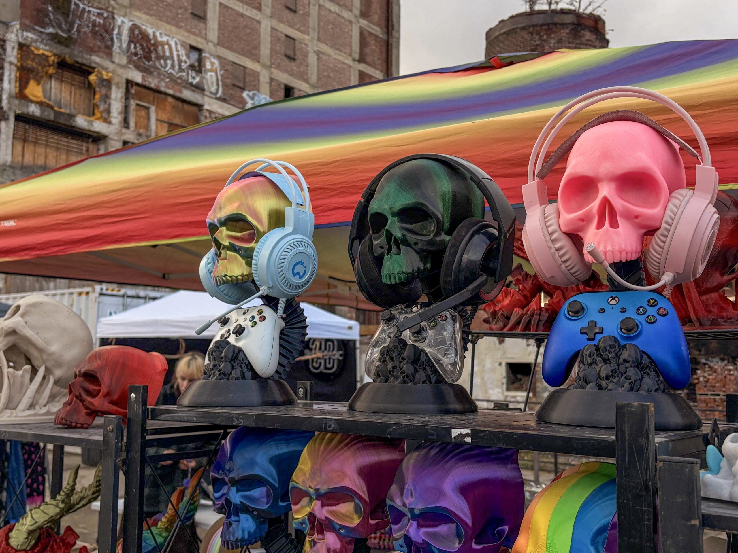 Skull video game controller stands by Deadly Creations, Nov. 2, 2025. (Photo by Mel Banta / The Louisville Cardinal)