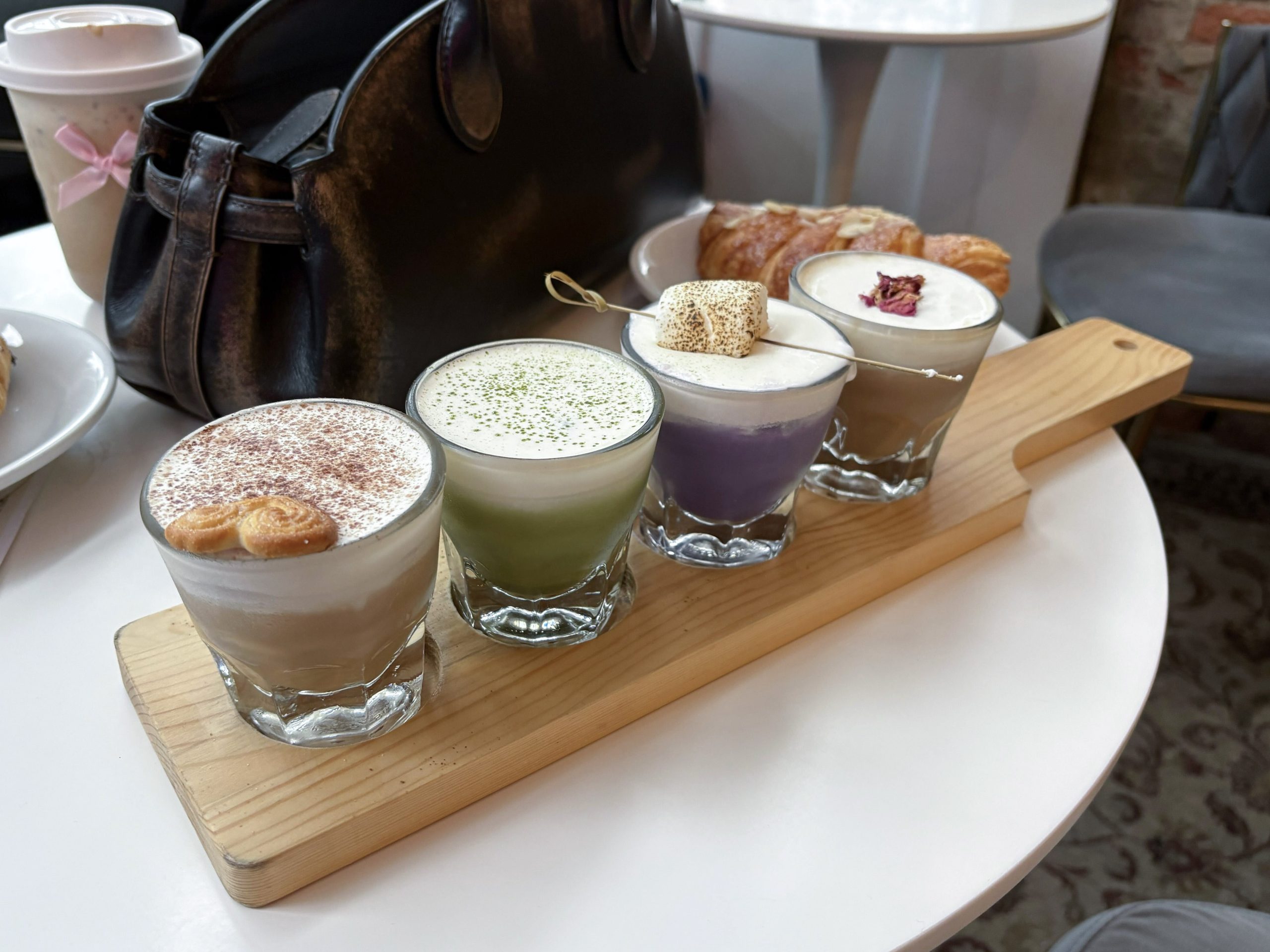 From left, the butterscotch, matcha, ube and strawberry rose iced coffee flight is a signature menu item at Phalcha Coffee, March 7, 2026. (Photo by Roxy Osborne / The Louisville Cardinal)