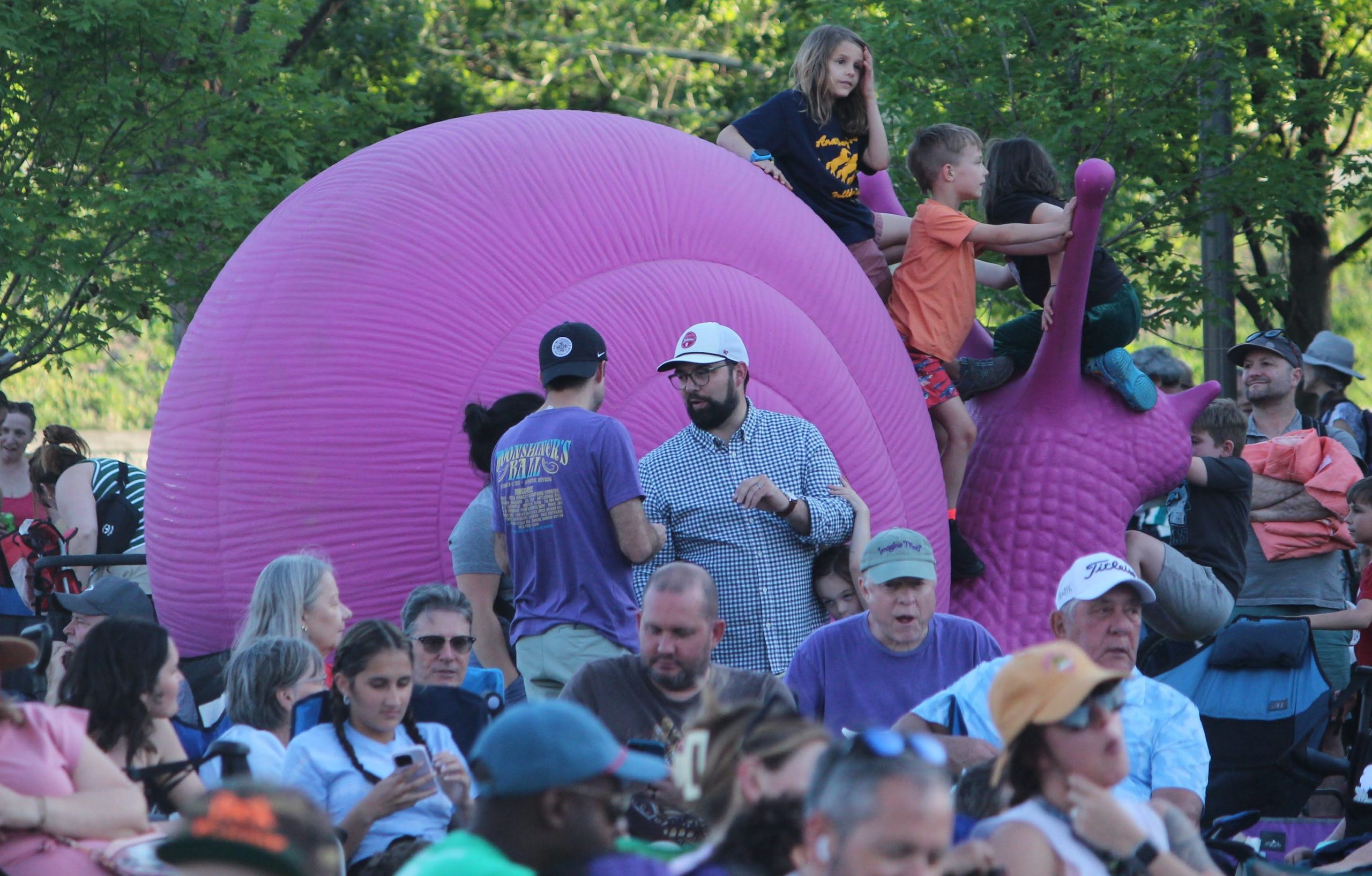Children climbing and playing on the pink snail at Waterfront Wednesday on April 22, 2026. The pink snails “migrate” across Louisville to spread awareness for Norton Cancer Institute Breast Health Program.(Photo by Alex Woodard / The Louisville Cardinal)