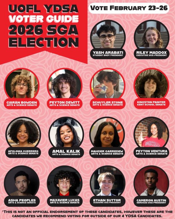 A voter guide for the 2026 SGA General Election posted by U of L’s YDSA chapter on Feb. 23, 2026. (Image Courtesy / U of L YDSA)